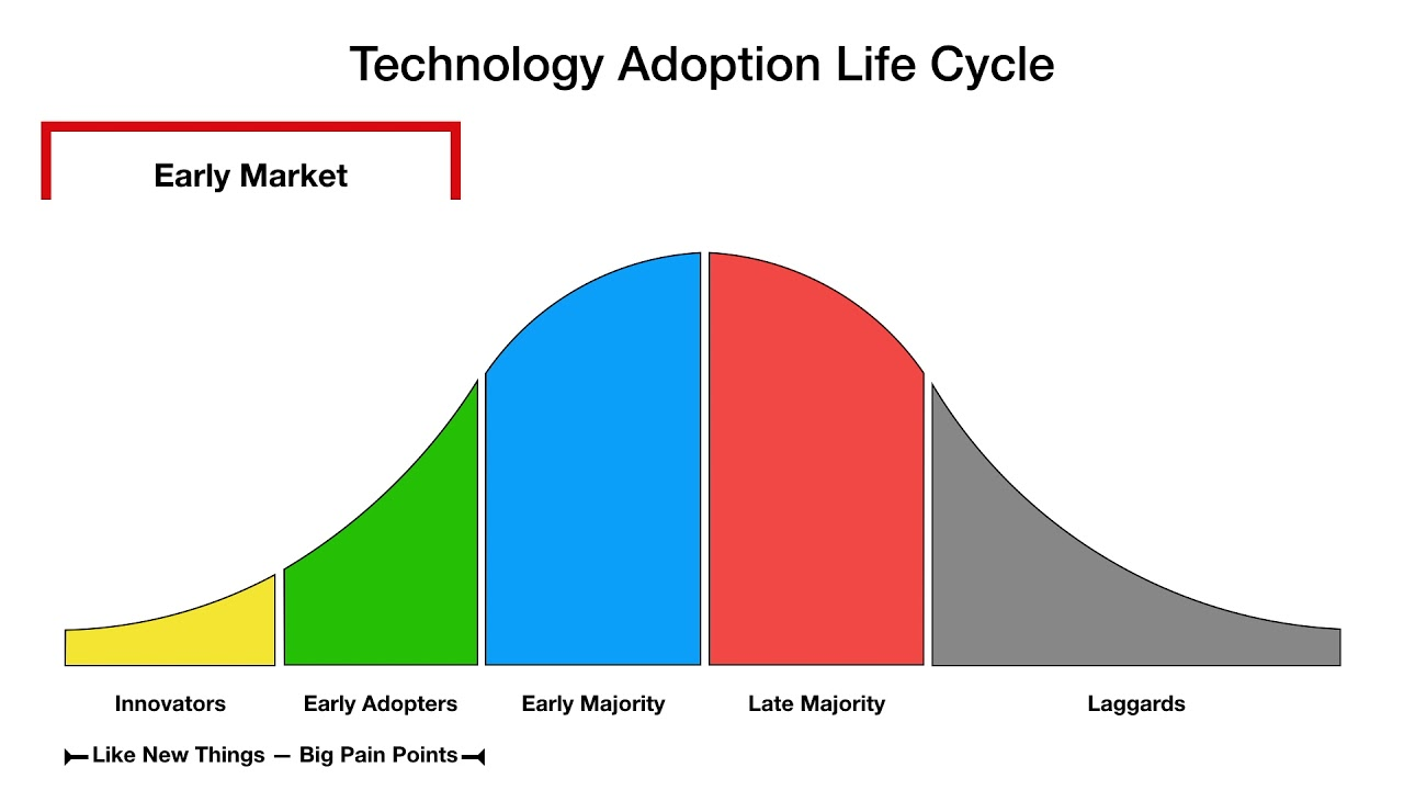 Early majority: Pragmatic. Looking to adopt only proven technology with good references. Constitutes 1/3 of market and fundamental to profits and growth