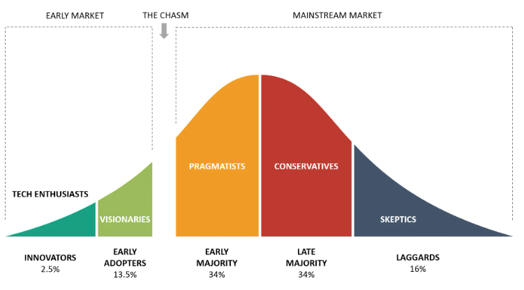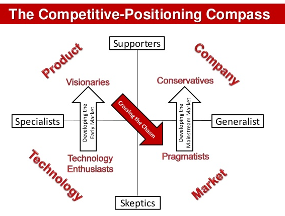 Companies stumble during transition from visionaries to pragmatists as they fail to change the sales pitch. A company may be trumpeting it’s early success in pilots when the pragmatists wants to hear about up and running production installations. The company says ‘state of the art’ when the customer wants to hear ‘industry standard’