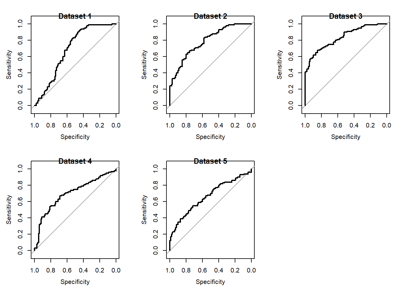 The below function takes a dataset,fits a random forest model and returns an ROC curve for each dataset.