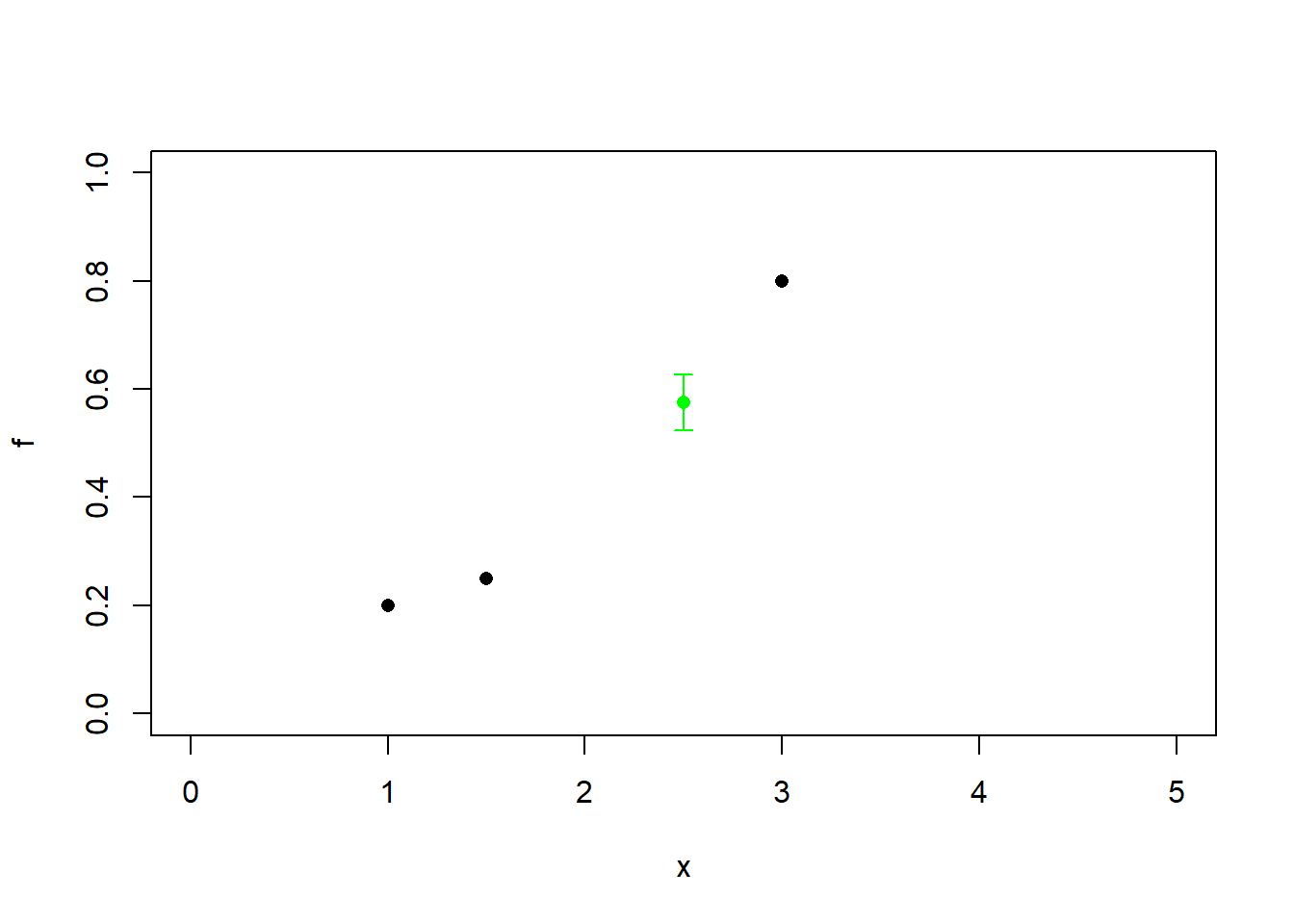 plot(data.frame(x = c(1,1.5,3) , f = c(0.2,0.25,0.8)),xlim=c(0,5),ylim = c(0,1),pch=16)