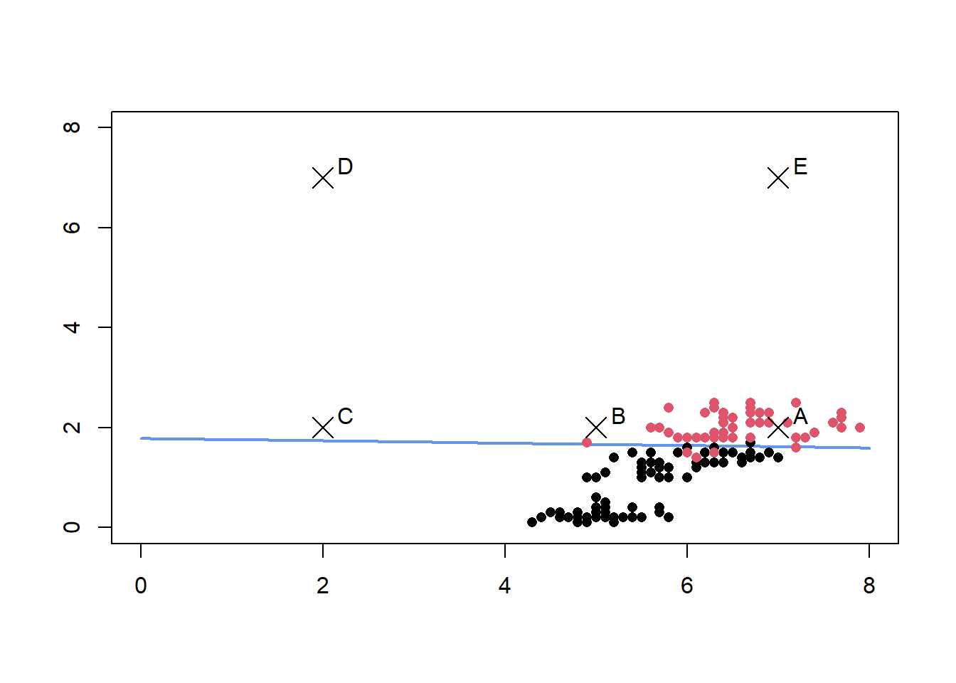 All 5 points are predicted to be virginica with a very high probability given they fall on one side of the decision boundary. However the width of the prediction intervals for these five points vary considerably. The points D and E are so far away from the decision boundary that there is little uncertainty in the predictions, the points A,B and C are more interesting.