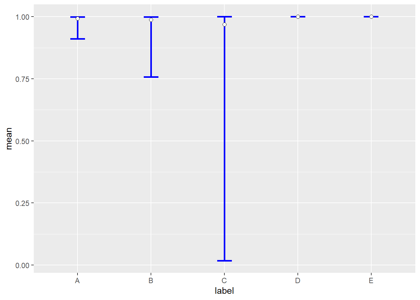 ggplot() + geom_errorbar(data=results,mapping=aes(x=label,ymin=lb,ymax=ub),