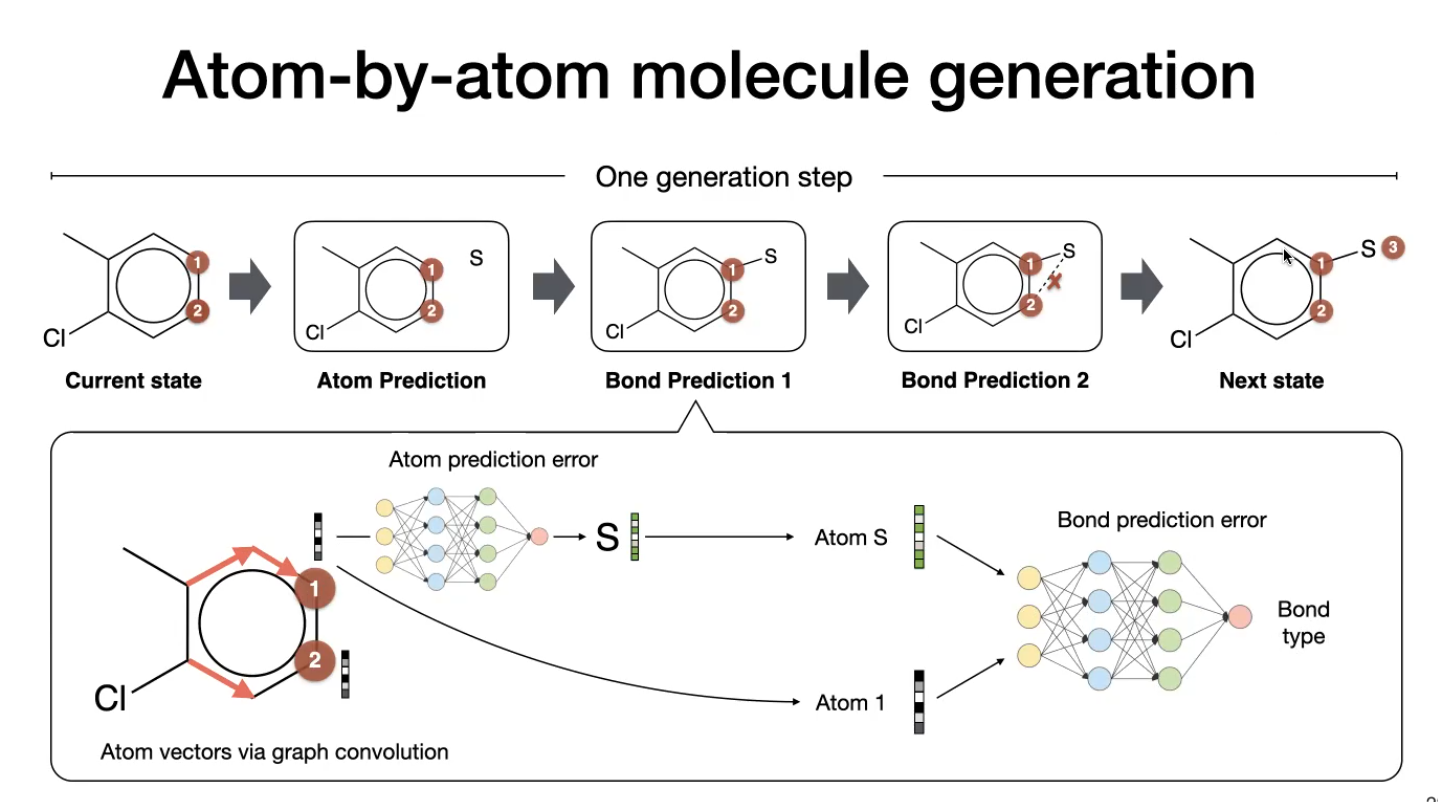 - Simple to implement but higher computational complexity.(Need to re-encode graph after adding every new atom)