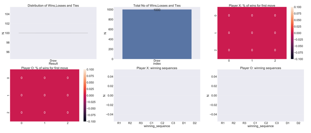 As expected X wins more games than O as it gets to start first and make more moves than O. For both players, occupying the central square in the first move maximizes the chances of winning.